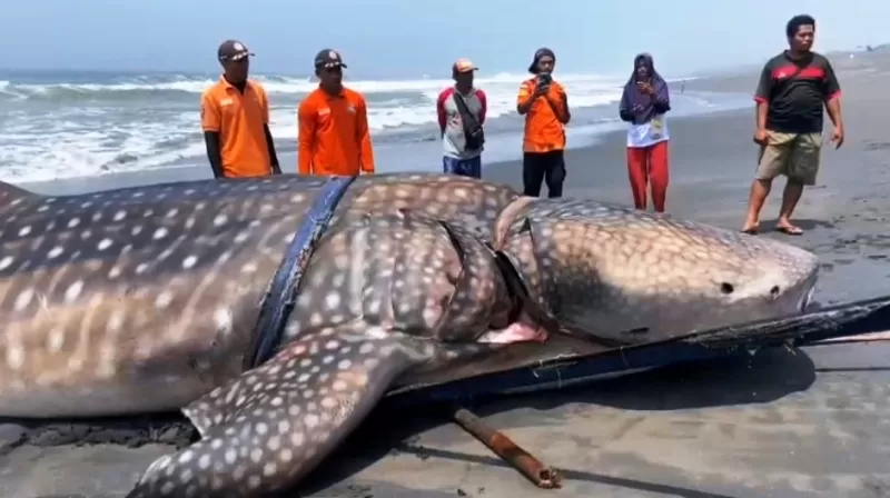 Jangkauan Jakarta Pusat – Bangkai Hiu Seberat sebuah kejadian mengejutkan tercatat di Kabupaten Cilacap, Jawa Tengah — seekor hiu tutul (Rhincodon typus) ditemukan dalam kondisi mati dan terdampar di Pantai Kemiren, Kelurahan Tegalkamulyan. Spesies ini diperkirakan memiliki panjang sekitar 9 meter dan berat mencapai ±2 ton.